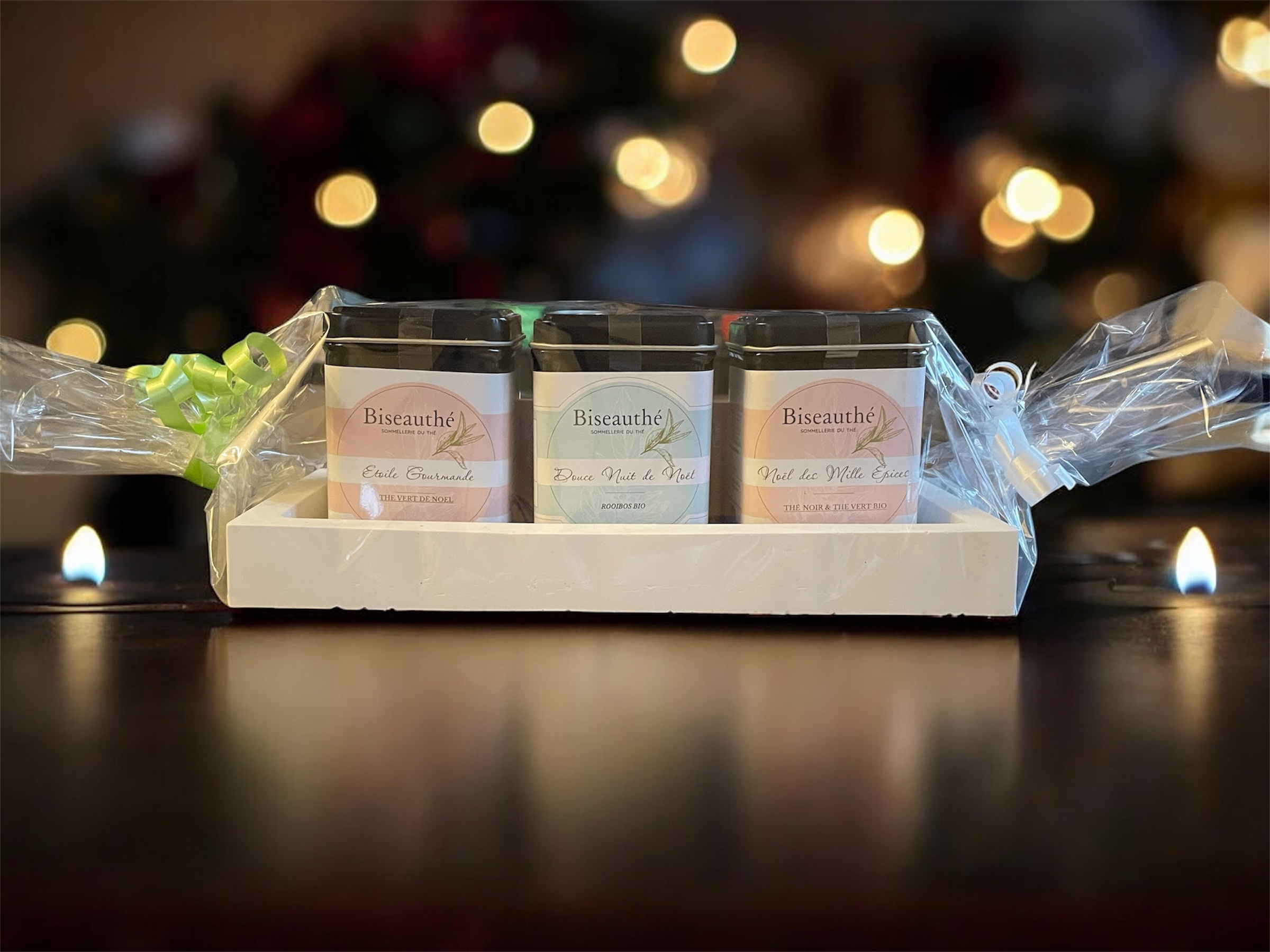 Plateau en jesmonite* de couleur blanc composé de 2 Thés de Noël “Etoile Gourmande – Noël des Mille Epices Bio et 1 Rooibos de Noël Bio “Douce Nuit de Noël”.